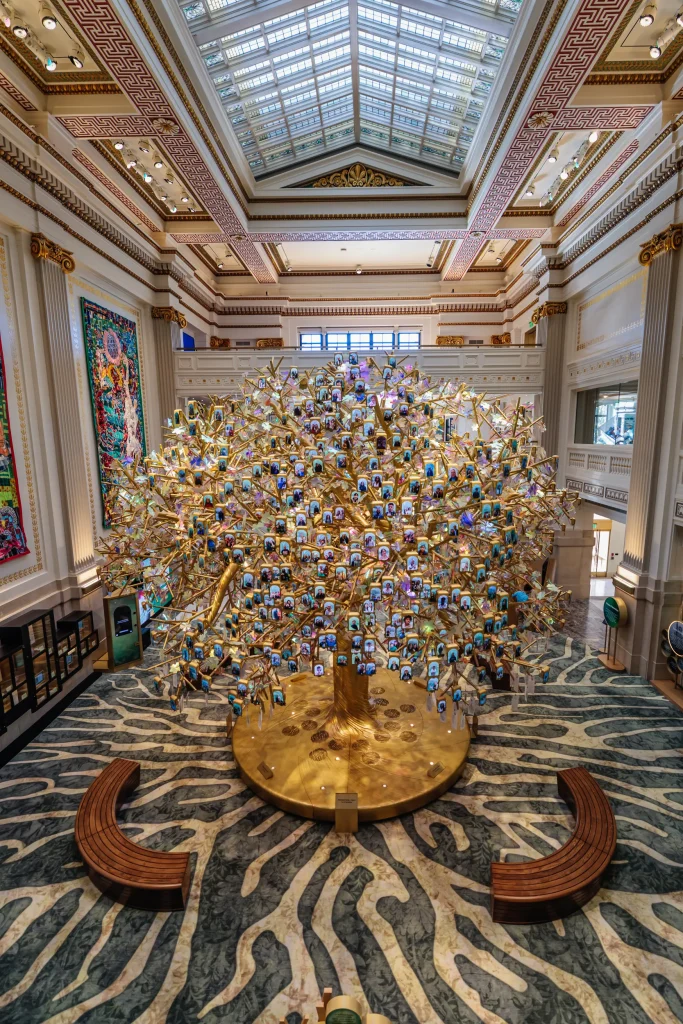 At the heart of the restored Riggs Bank hall stands the Tree of Generations, a luminous golden sculpture symbolizing the connections among innovators, artists, and entrepreneurs whose work has shaped the American story. The installation rises beneath a grand skylight and classical ornamentation, filling the space with both light and metaphor.