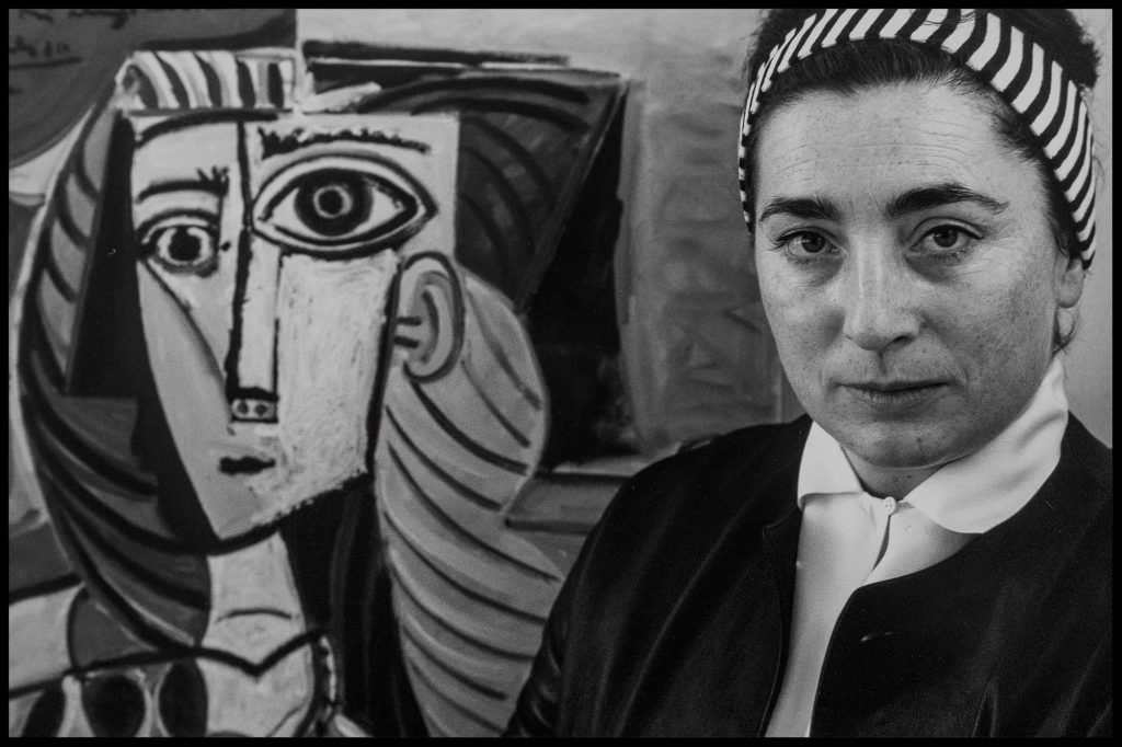 Jacqueline Roque (1927–1986) (shown above) was best known as the muse and second wife of Pablo Picasso. Their marriage lasted 11 years until his death, during which time he created over 400 portraits of her, more than any of Picasso’s other loves. Here, she poses with her striking portrait created in California. The photograph was made by David Douglas Duncan (1916-2018), an American photojournalist, known for his combat photographs and for his extensive domestic photography of Pablo Picasso and his wife Jacqueline.